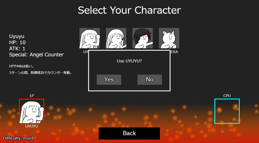 簡単なルールの2D格闘ゲーム。4人のキャラクターから1人選んでCPU(難易度4種類)と対戦する。
