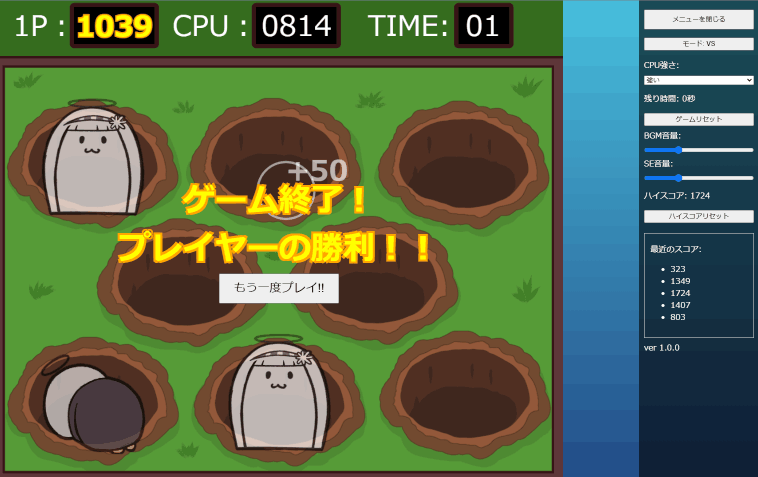 30秒間、穴から出てくるぽきゅゆり、バッドぽきゅ、うんしょを叩いてハイスコアを狙うゲーム。