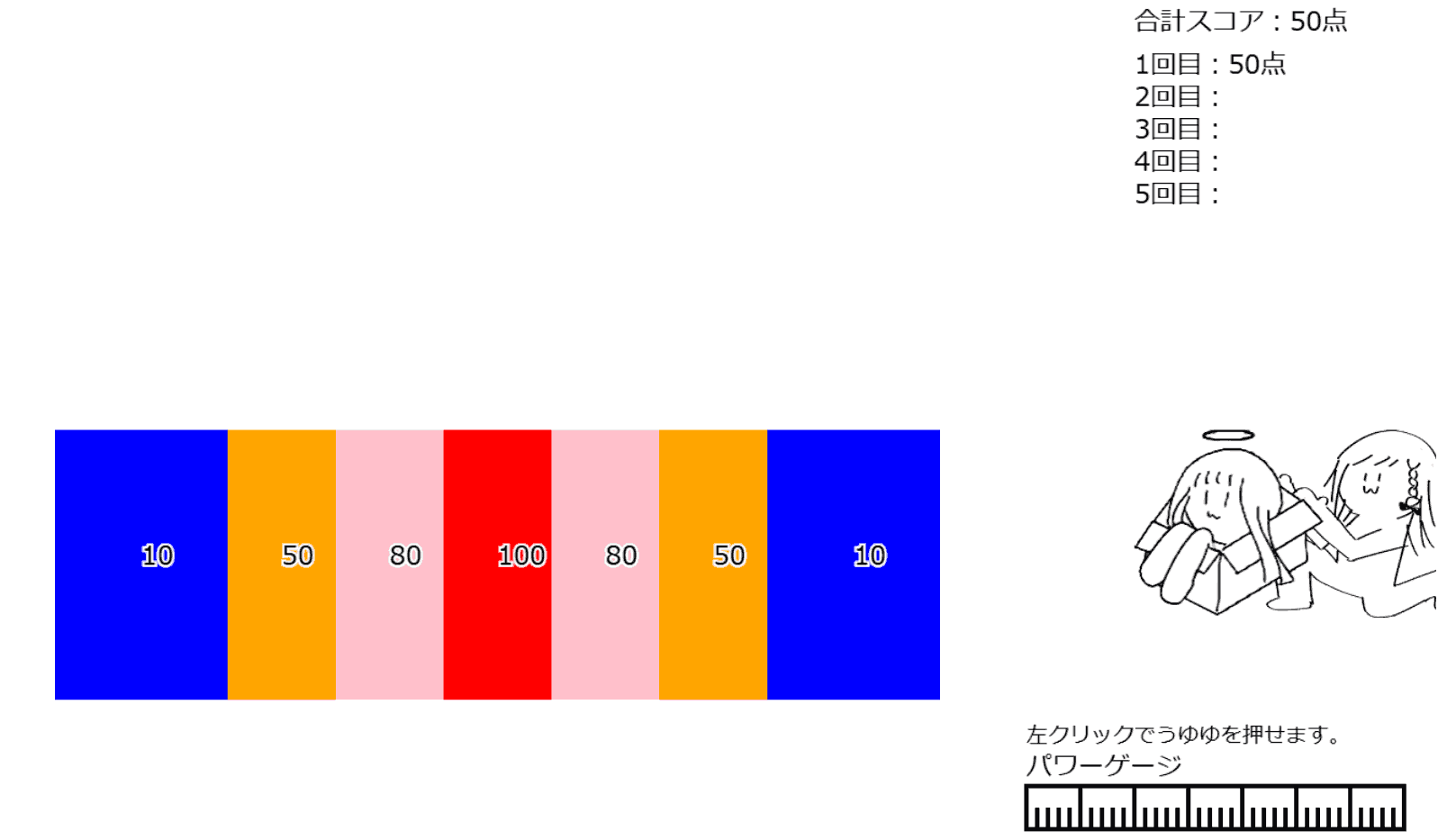 画面クリックでパワーゲージが出現し、再度画面クリックでえれなちゃんがうゆゆを押して、5回のスコア合計値の高得点を狙うゲーム。